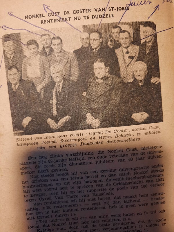 Terwijl mijn peter op onze koer , zomaar op de grond , met een afgedankt sinaasappelbakje onder zijn hoofd , als hoofdkussen , in het zonnetje, zijn roes lag uit te slapen ben ik stilletjes naar het duivenzolderke getrokken om de " Geschelpten " te feliciteren met zijn overwinning .