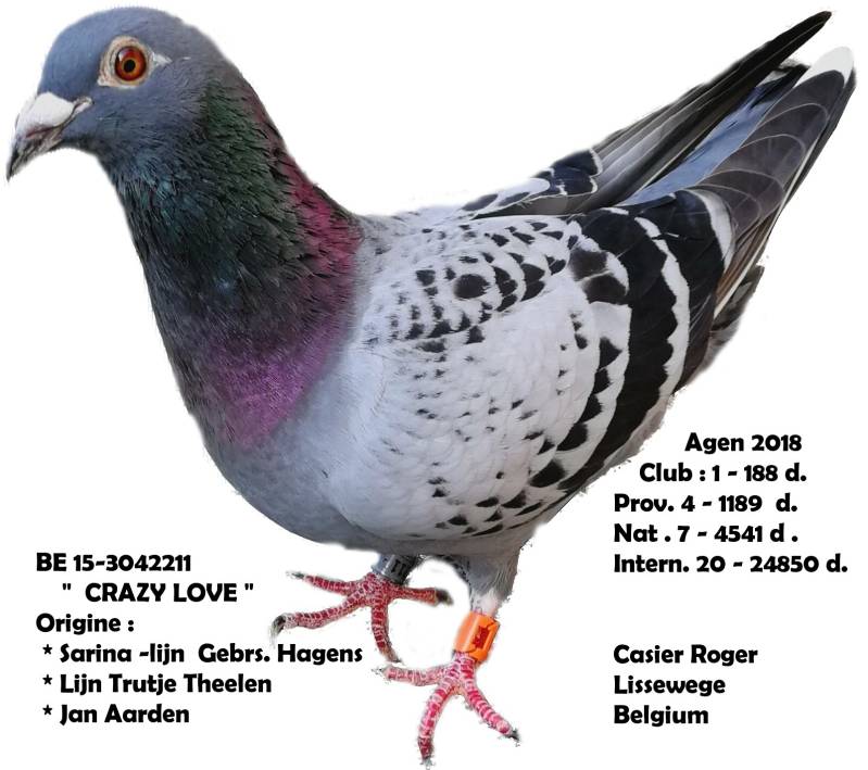 De winnares , ondertussen CRAZY LOVE gedoopt , is een dochter van mijn betreurde KLEINE ZWARTEN x GOUD VAN TIEST . Zusje van ARCHIMEDES ( mijn eerste van Pau –342/2587 nationaal )