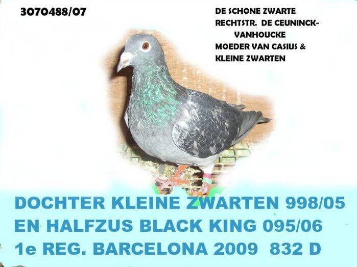 En de SCHONE ZWARTE was al zeven jaar en weinig productief . Ze had nochtans goeie papieren !! Uit de lijn van DE DONKERE BARCELONA THEELEN , DE BLAUWE THEELEN , SUPERSTAR en HET ZWART TRUTJE . Die soort heeft DCVH groot gemaakt !! En ik had er al eens iets van weg geschonken en opeens kreeg ik verheugend nieuws uit Lokeren van Gunther Smet dat een zoon van DE SCHONE ZWARTE het schitterend deed !!