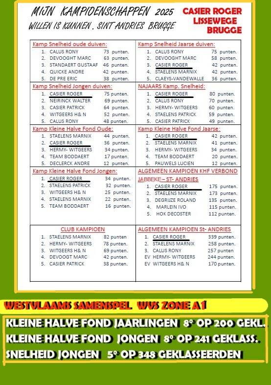 Het kampioenschap snelheid jonge duiven in WILLEN IS KUNNEN staat op mijn naam . Mijn broertje is derde .