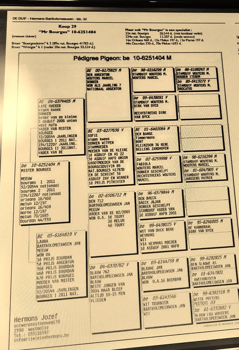 In de stamboom van Mister Bourges zie je wereldberoemde namen zoals TOURNIER -HOUBEN - VAN DYCK en uiteraard ook MARCEL WOUTERS . In de stamboom van zijn zoon ELVIS zie je de lijnenteelt naar MISTER BOURGES via een koppeling met een kleindochter van zijn zus , DE BOURGESDUIVIN !