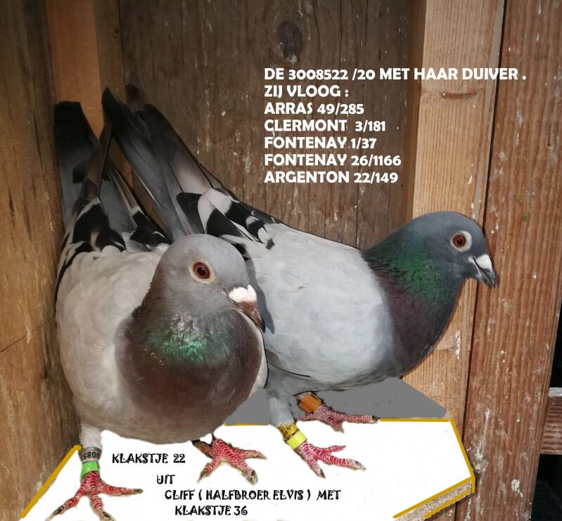 Die 6de september van 2020 bewezen de 2 zusjes hun grote klasse , door ondanks de handicap van de TE GROTE JONGEN , toch nog een mooie prestatie neer te zetten . Ze arriveerden in 7 minuten en wonnen prijs 22 & 23 op 149 jonge duiven aan een snelheid van +/- 1000 meter per minuut , en als ik goed kan rekenen nog 127 duiven achter zich latend . Op de foto hieronder ziet U , KLAKSTJE 22 met haar duiver , waar ze het nest mee deelde , onmiddellijk na haar aankomst .
