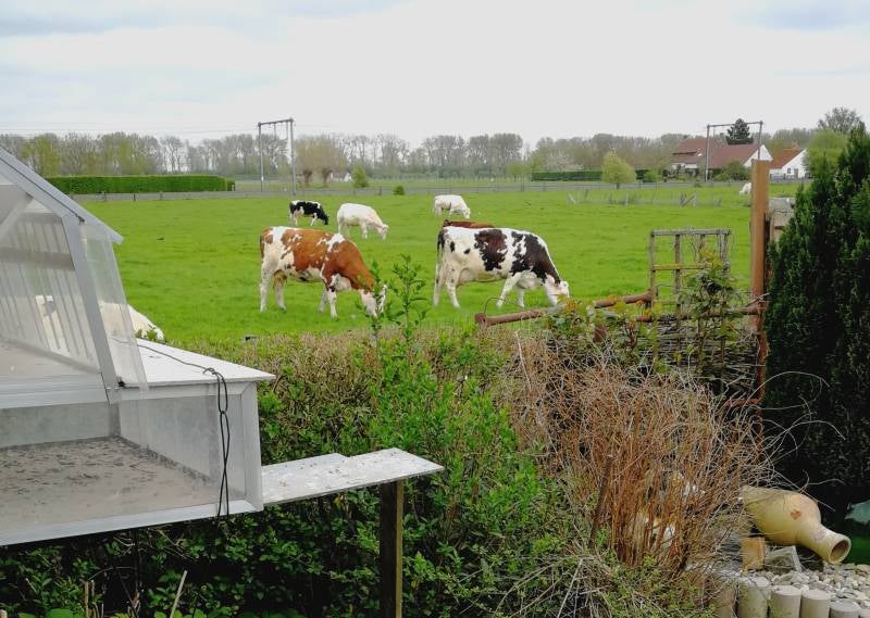 Ik had er dus geen rekening mee gehouden dat die jonge duivinnen nog nooit een koe aanschouwd hadden . Ze verpinkten niet als de was op een paar meter hing te wapperen , ook niet als er een trein voorbij raasde op een paar 100 meter , als de brandweer en den 101 met loeiende sirene ‘s van jetje gaven aan de andere kant . Zelfs een helikopter was dagelijkse kost !!