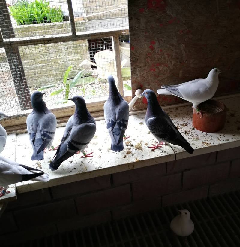 3 x inkijk in de ren van de jaarling-duivinnen . Bemerk de conditie en de rode pootjes !!!