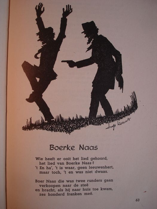 Boer Naas, `die maar een boer en was, nochtans was scherp van zin . Hij ging en kocht een zevenschot en stak er kogels in ..... heeft op de markt twee koeien verkocht en is op weg naar huis, `met stapkes licht, en met de beurze zwaar'. Voor alle zekerheid heeft hij ook een geladen revolver gekocht. Dan wordt hij door een rover met een pistool overvallen. Jammerend vraagt Naas de rover om hem een kogel door de hoed te schieten, dan kan zijn vrouw zien dat hij het geld niet heeft verdronken, maar dat hij echt beroofd is. De rover doet dit, en jaagt op verzoek van boer Naas vervolgens ook nog kogels door zijn jas en broek.