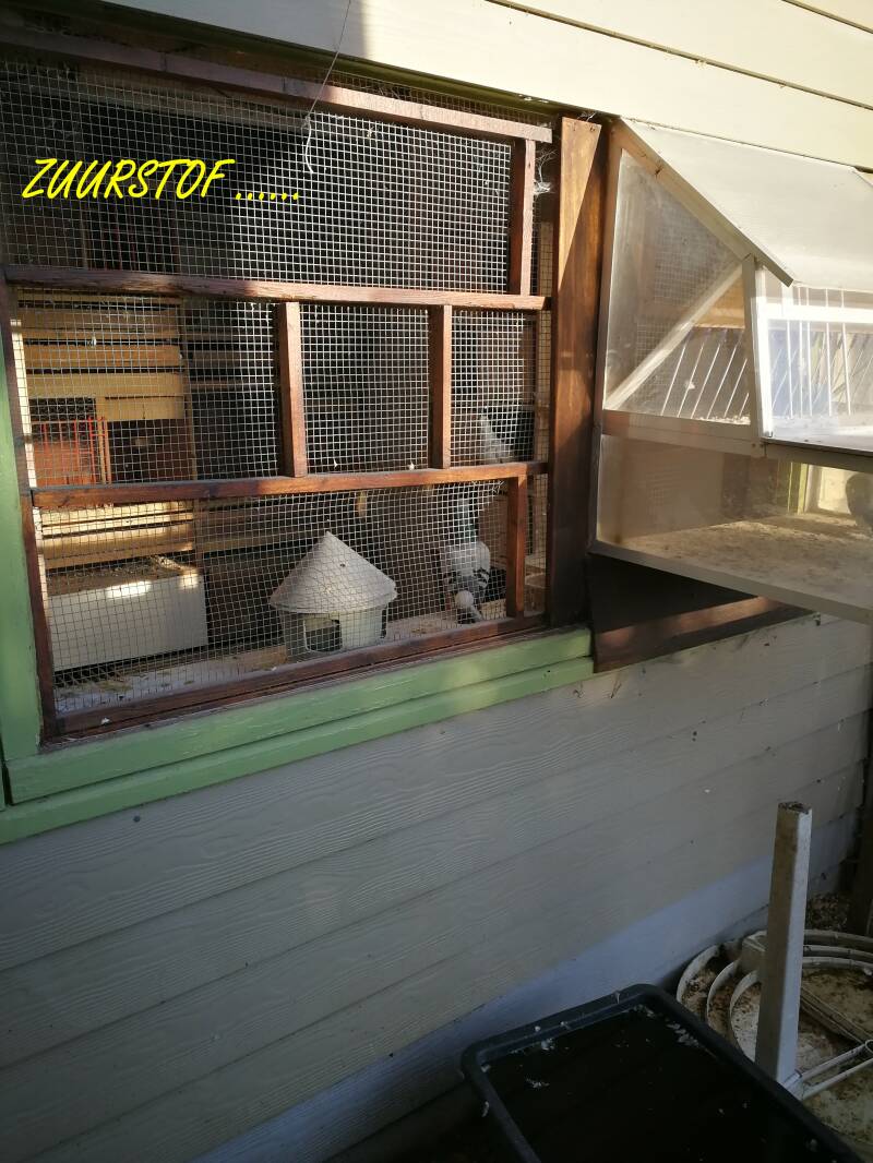 In die erker zit ook een schuifje dat toegang geeft tot de buitenwereld en zodoende zitten deze jonge duiven van +/- 25 dagen oud al na één dag buiten op de valplank .