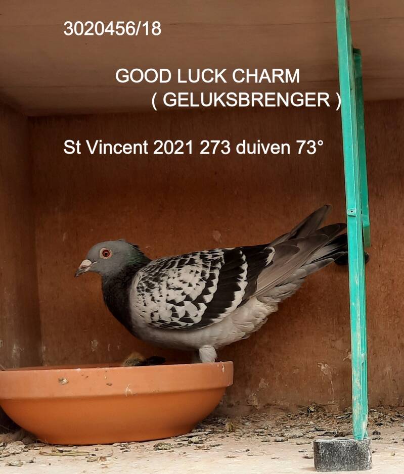 Nummer 1 , " GOOD LUCK CHARM " genaamd is nochtans van goede huize en won op haar eerste marathonwedstrijd een mooie prijs op St Vincent in 2021 . Zij is ook nog eens de halfzus van " DE ROGER " van Tom Van Nieuwenhuyze die ondanks zware kwetsuren 4 mooie uitslagen bijeen vloog uit Barcelona .