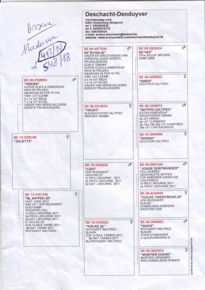 Gekweekt in de Lisseweegse polders met als vader een duiver van Peter Bours en als moeder een duivin van Deschacht - Denduyver .