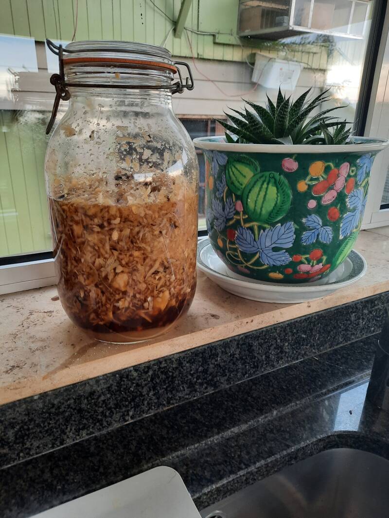 Ik heb het recept een beetje geperfectioneerd en wat dingen toegevoegd en het geheel staat dan te " trekken " op mijn vensterbank in een weckpot .