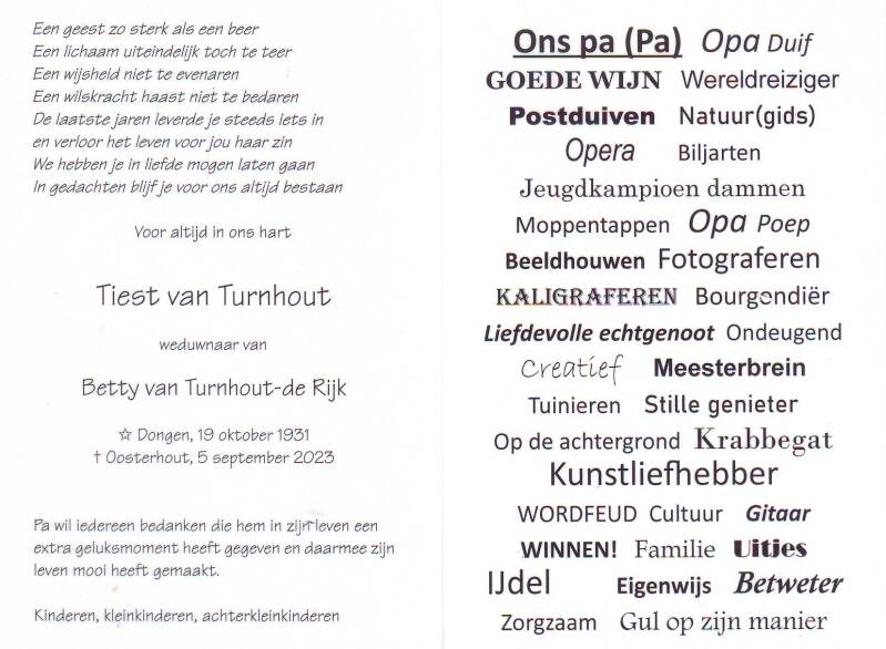 Ik ga mij verder beperken tot het originele rouwprentje opgesteld door de familie met enkele trefwoorden die op hem van toepassing waren .
